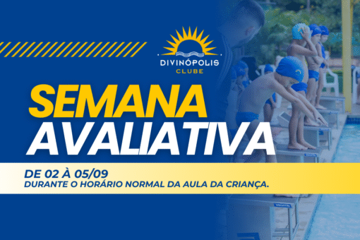Semana Avaliativa de Natação 02 a 05 de setembro Durante o horário normal da aula da criança. Será o momento de acompanhar o desenvolvimento e evolução dos nossos pequenos na piscina!...