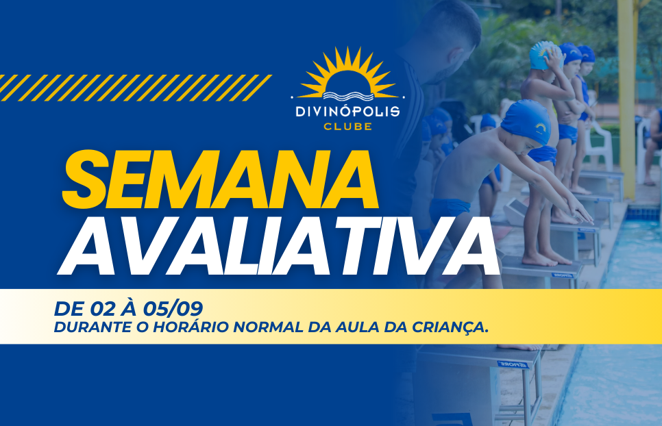 Semana Avaliativa de Natação 02 a 05 de setembro Durante o horário normal da aula da criança. Será o momento de acompanhar o desenvolvimento e evolução dos nossos pequenos na piscina!...
