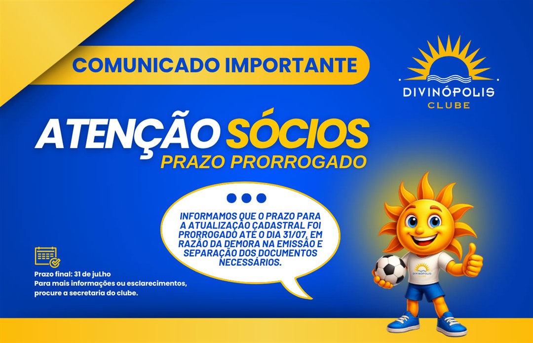 Sócios, atenção! O prazo para atualização cadastral termina quinta-feira (31/07). É rápido e fácil: preencha o formulário e anexe os documentos exigidos. Formulário disponível na secretaria e no siteD...